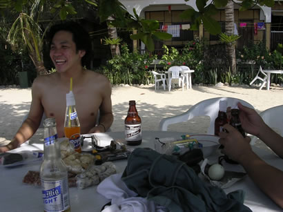 notice the random assortment of heart attack fingerfoods: chicharon, quail eggs, balot, salted peanuts. nothing beats pigging out under the shade during a hot summer day with a bottle of cold san miguel.. on a completely different island with great friends to boot. now this is a vacation.